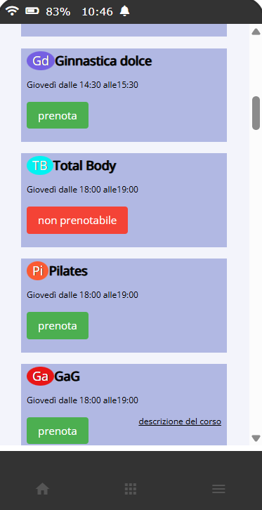 L’app permette all’utente di prenotare corsi in autonomia con un semplice clic. Per ogni corso è indicato: