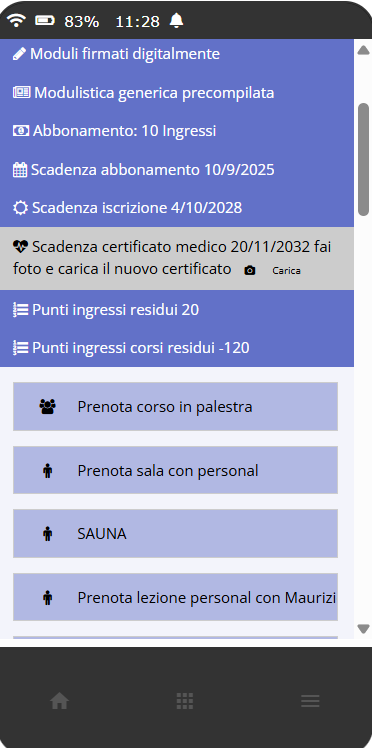 Ogni pulsante si attiva o disattiva in automatico secondo la situazione reale dell’utente (es. se il certificato è scaduto, la prenotazione viene bloccata e viene mostrato un messaggio personalizzato).